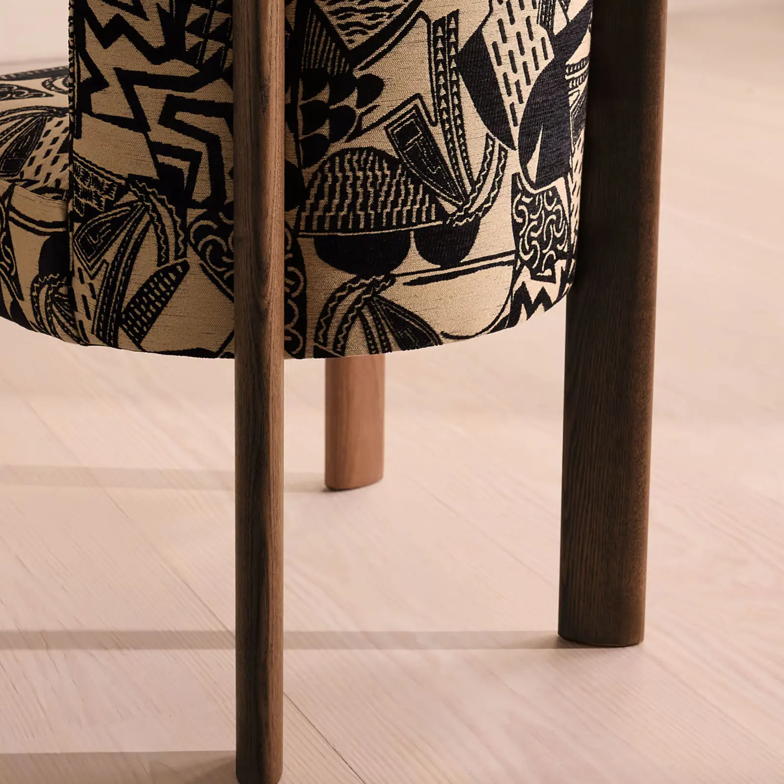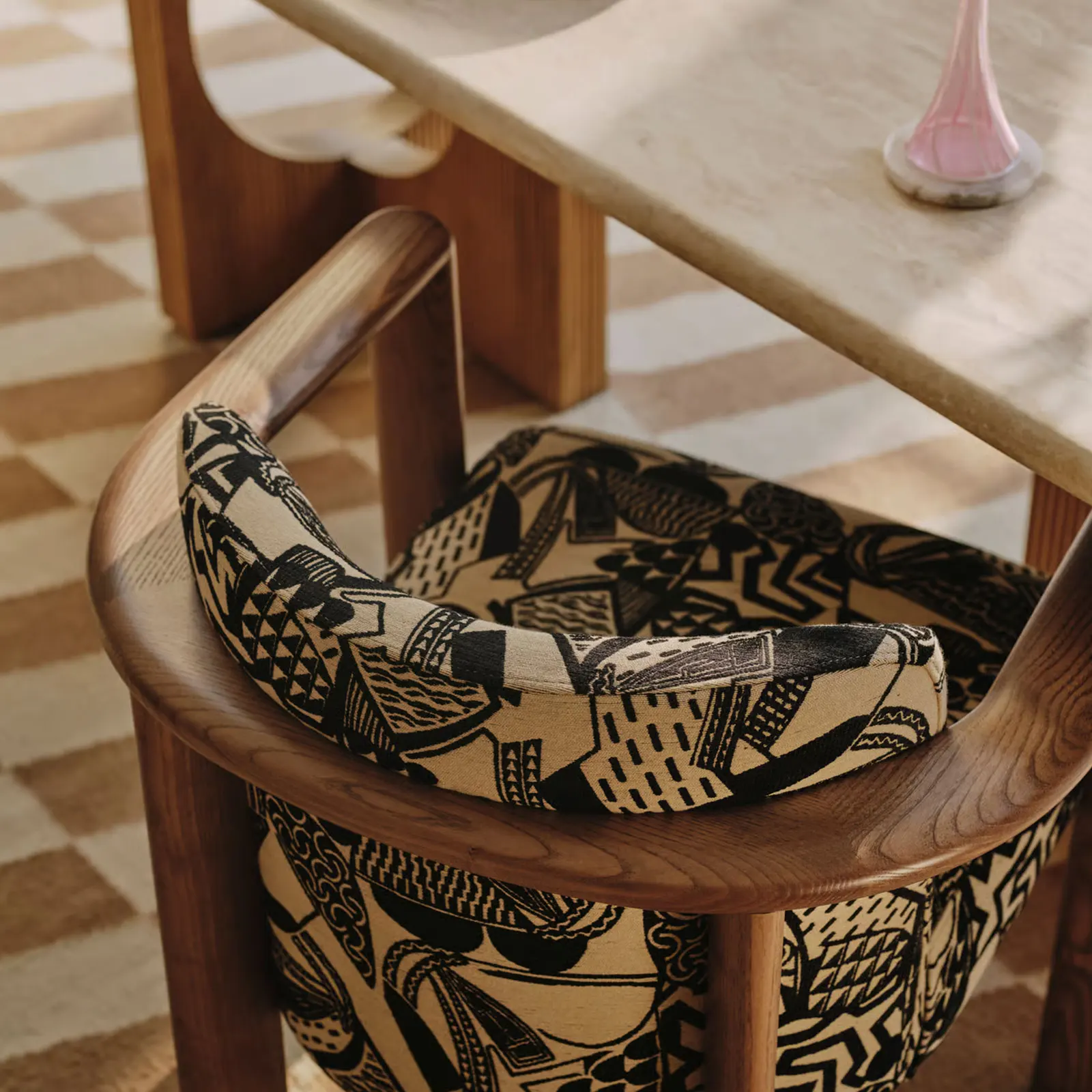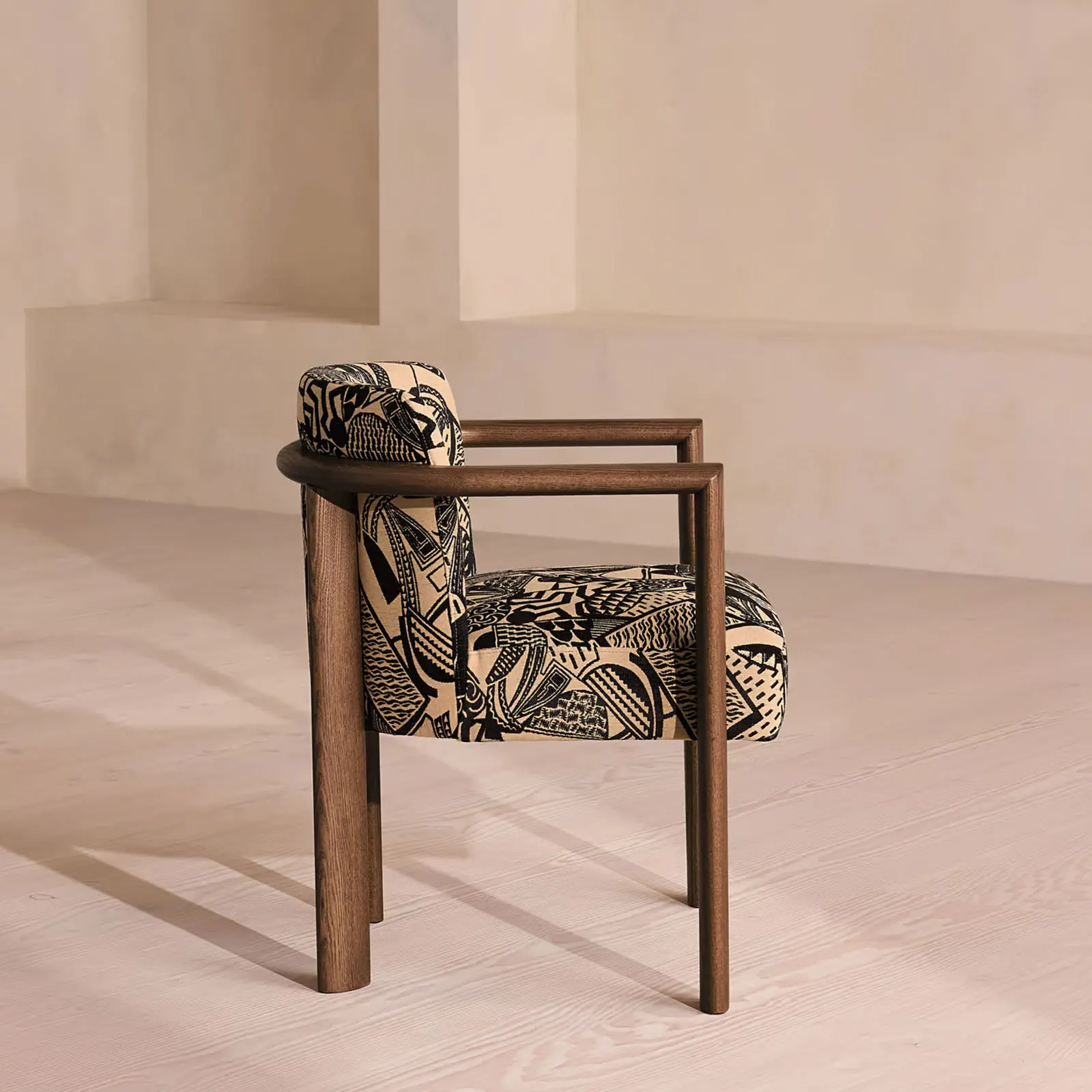 Shaped by traditional woodworking techniques and modern design precision, this dining armchair features a solid ash wood frame treated through a specialized multi-stage heat process that deepens grain definition and enhances durability. Each surface is hand wire-brushed and stained to achieve a balanced matte finish that highlights the organic texture of the wood. Upholstered cushions provide structured comfort and ergonomic support while preserving a clean architectural profile.
