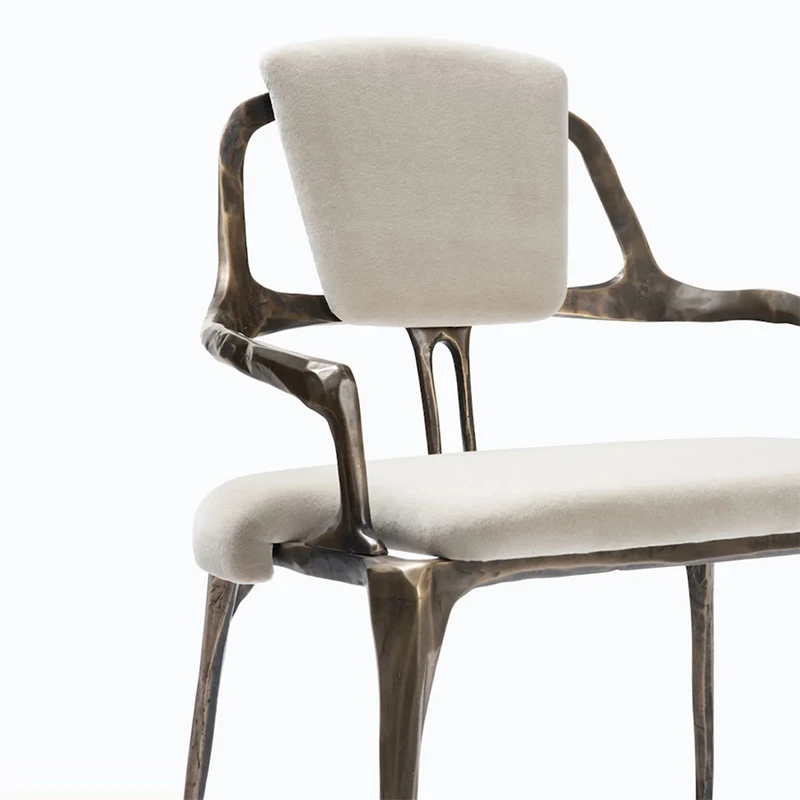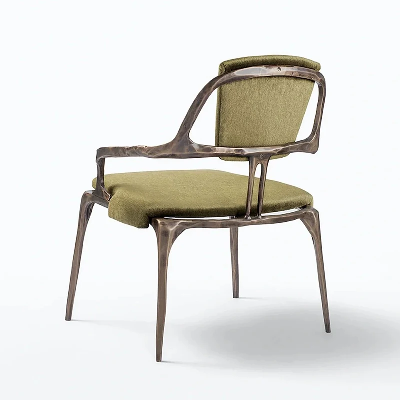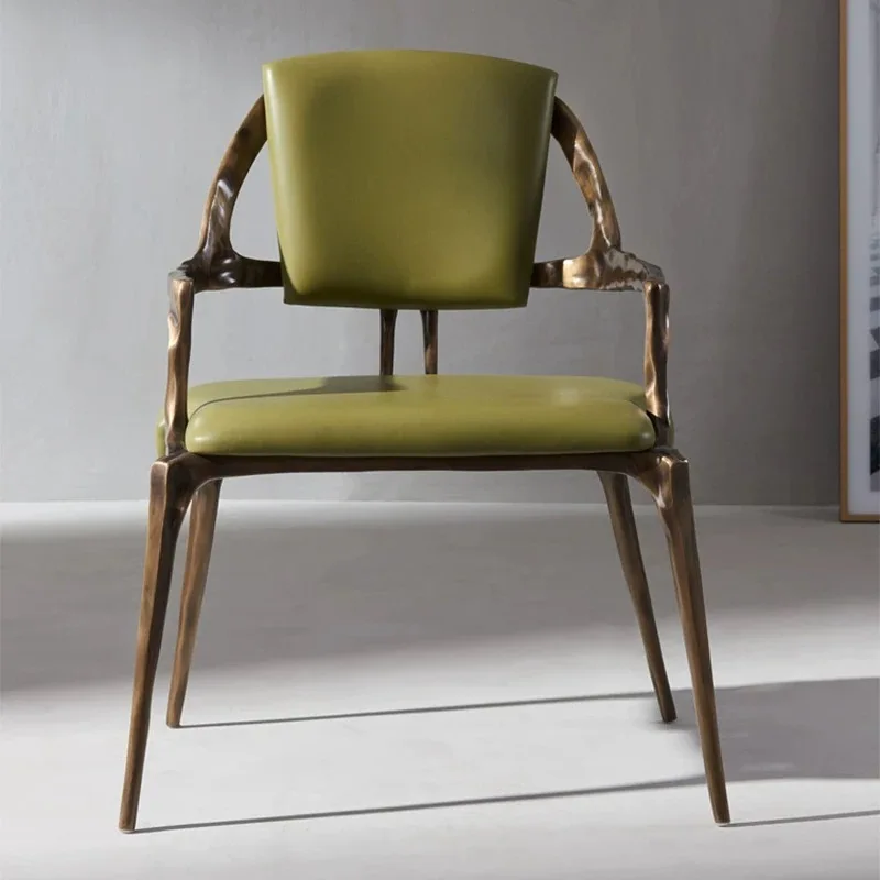 This modern luxury dining chair combines sculptural metal craftsmanship with premium upholstery to create a refined seating solution for elegant interiors. The golden brass frame provides structural strength while introducing a warm metallic accent that enhances visual depth. The upholstered seat cushion, covered in high-quality velvet or fabric, delivers softness and ergonomic comfort suitable for dining, coffee areas, restaurants, villas, and leisure environments.