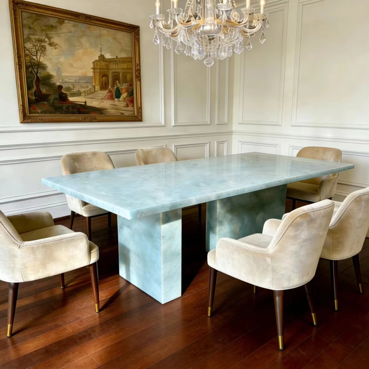 Designed for contemporary interiors, this rectangular jade glass dining table embodies modern luxury through its clean lines and luminous material composition. Constructed fully from high-quality glass, including the tabletop and supporting legs, it creates a seamless and visually light structure that enhances spatial openness. The jade glass surface delivers depth and refined texture while remaining waterproof, easy to maintain, and highly durable.
