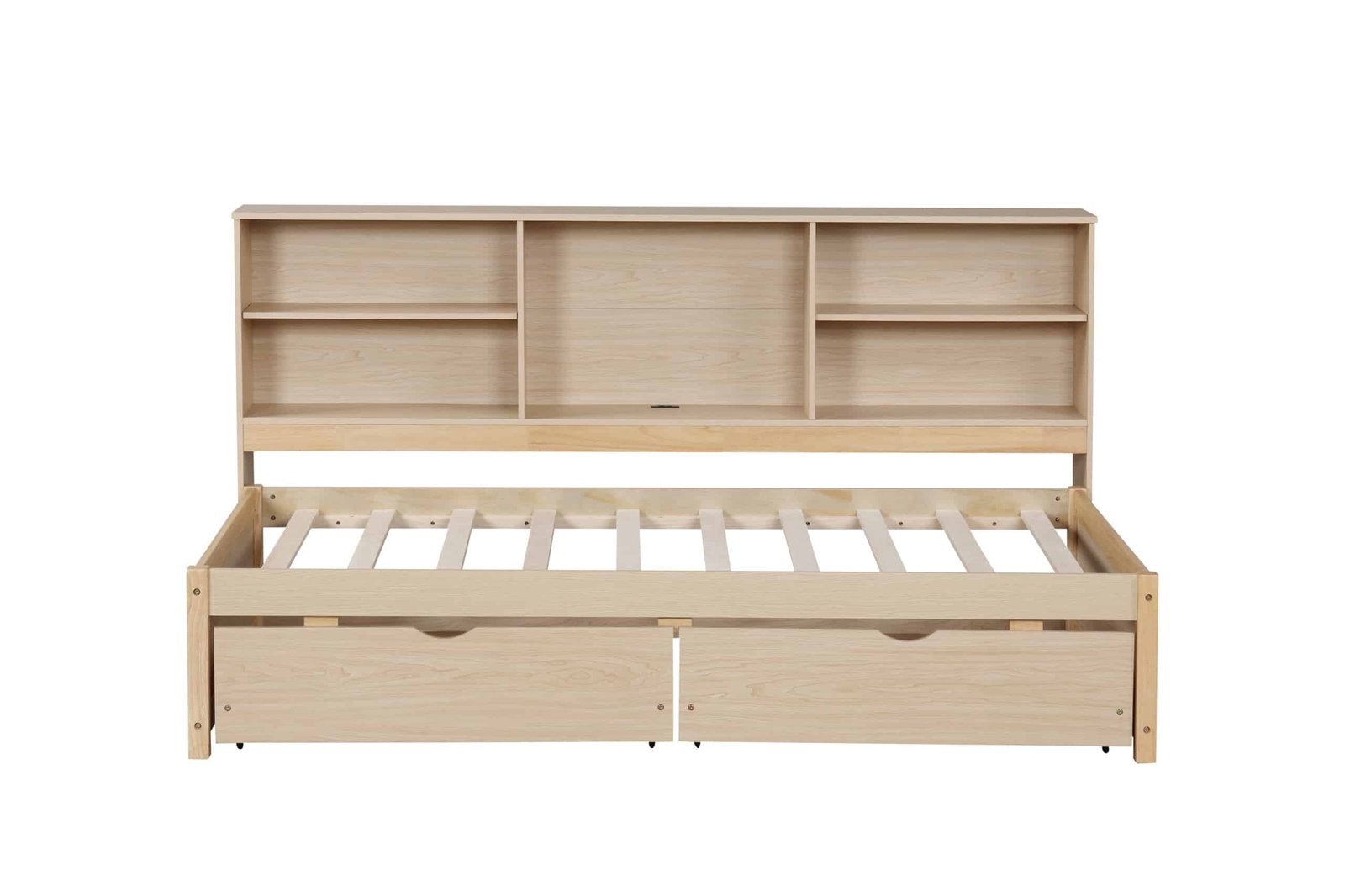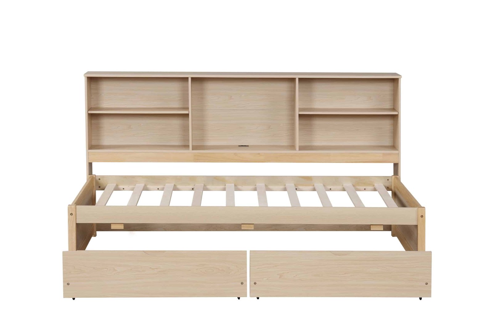 Particle Board Twin Size Bed Frame with Side Bookshelves and Built-in USB Port – Natural