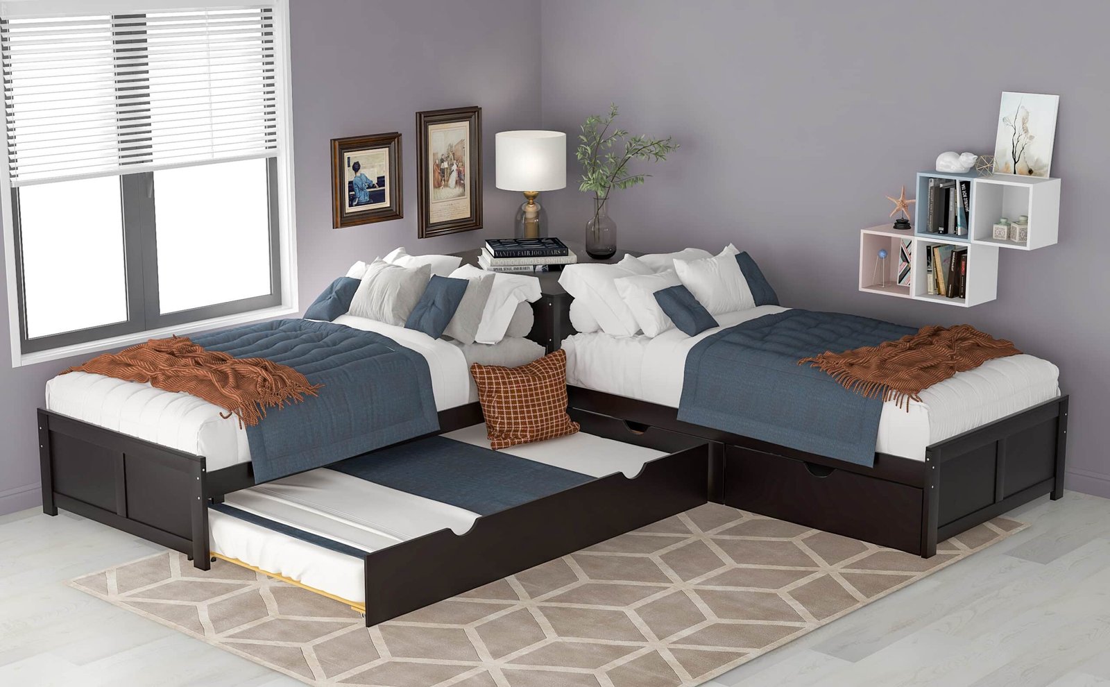 Introducing the L-shaped Platform Bed with Trundle and Drawers, perfectly designed for families and those with limited space. This innovative bed setup not only maximizes sleeping capacity but also combines functionality with style. Whether you’re accommodating guests or hosting sleepovers, this versatile solution is a must-have for any home.