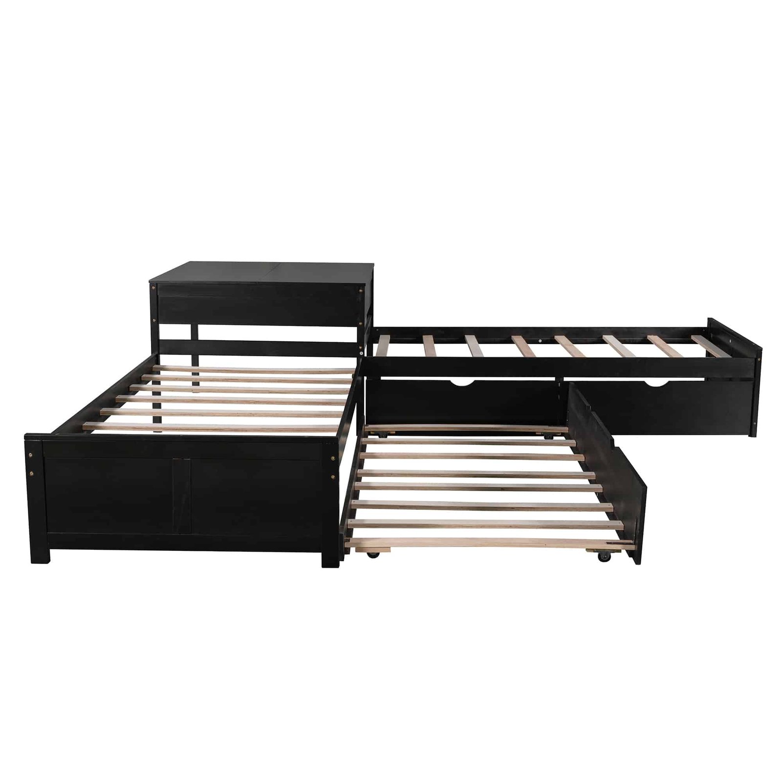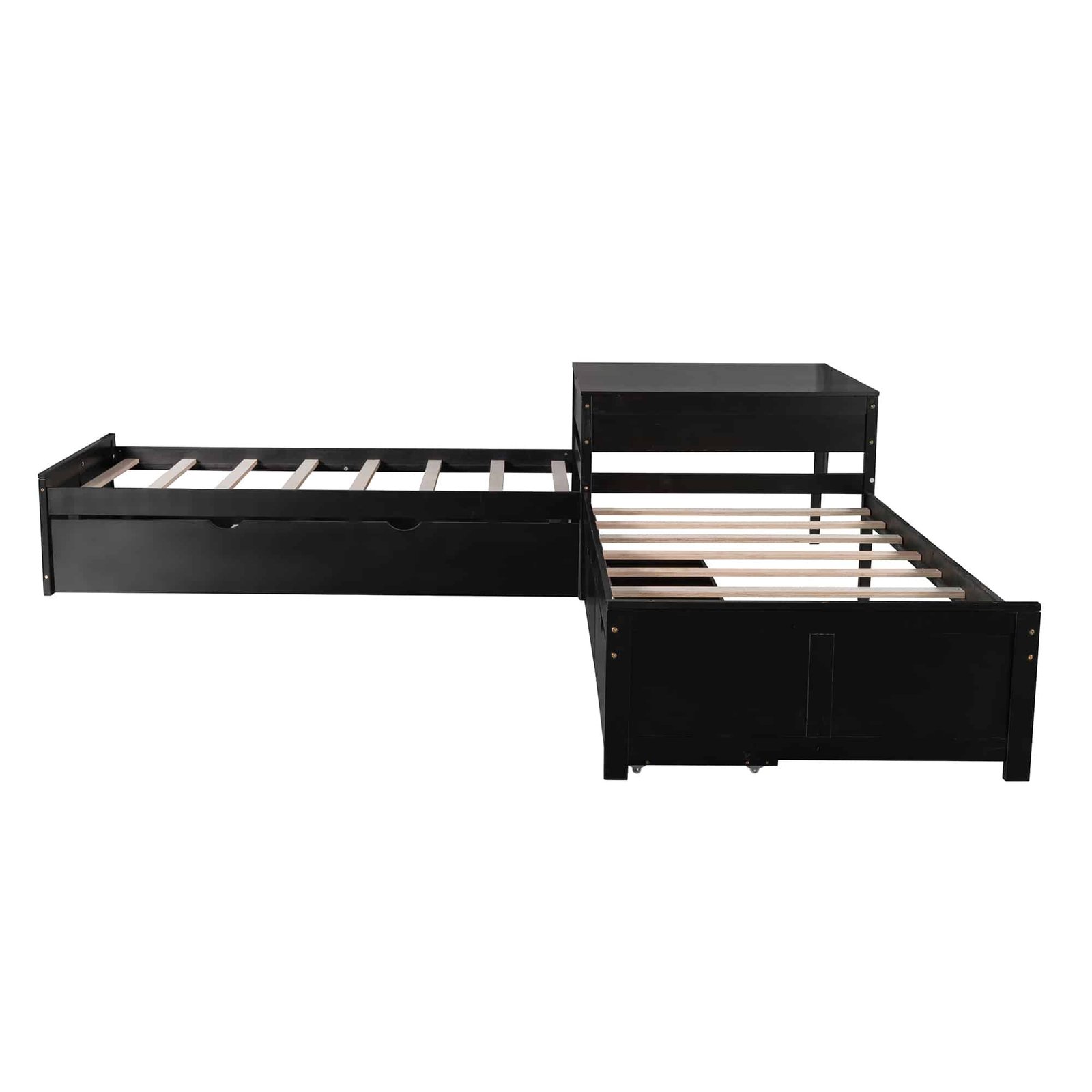 Pine Wood L-Shaped Platform Bed with Trundle and Built-in Desk – Espresso