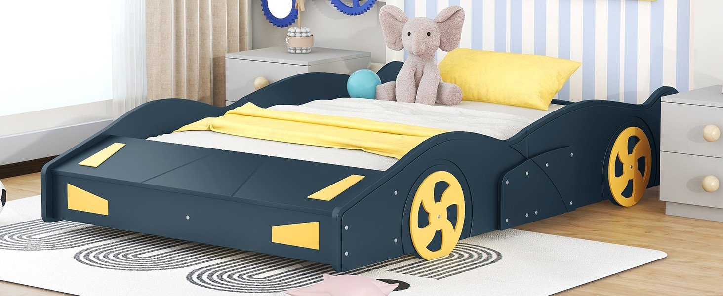Transform your bedroom into a race track with our Full Size Race Car-Shaped Platform Bed! Crafted with a striking dark blue and yellow design, this bed not only serves as a stunning focal point but also offers the ultimate combination of comfort, durability, and safety.