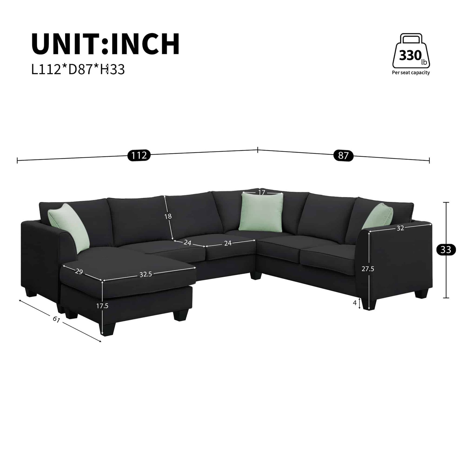 - Dimensions: Overall – 112″ x 87″ x 33″; Ottoman – 29″ x 32″