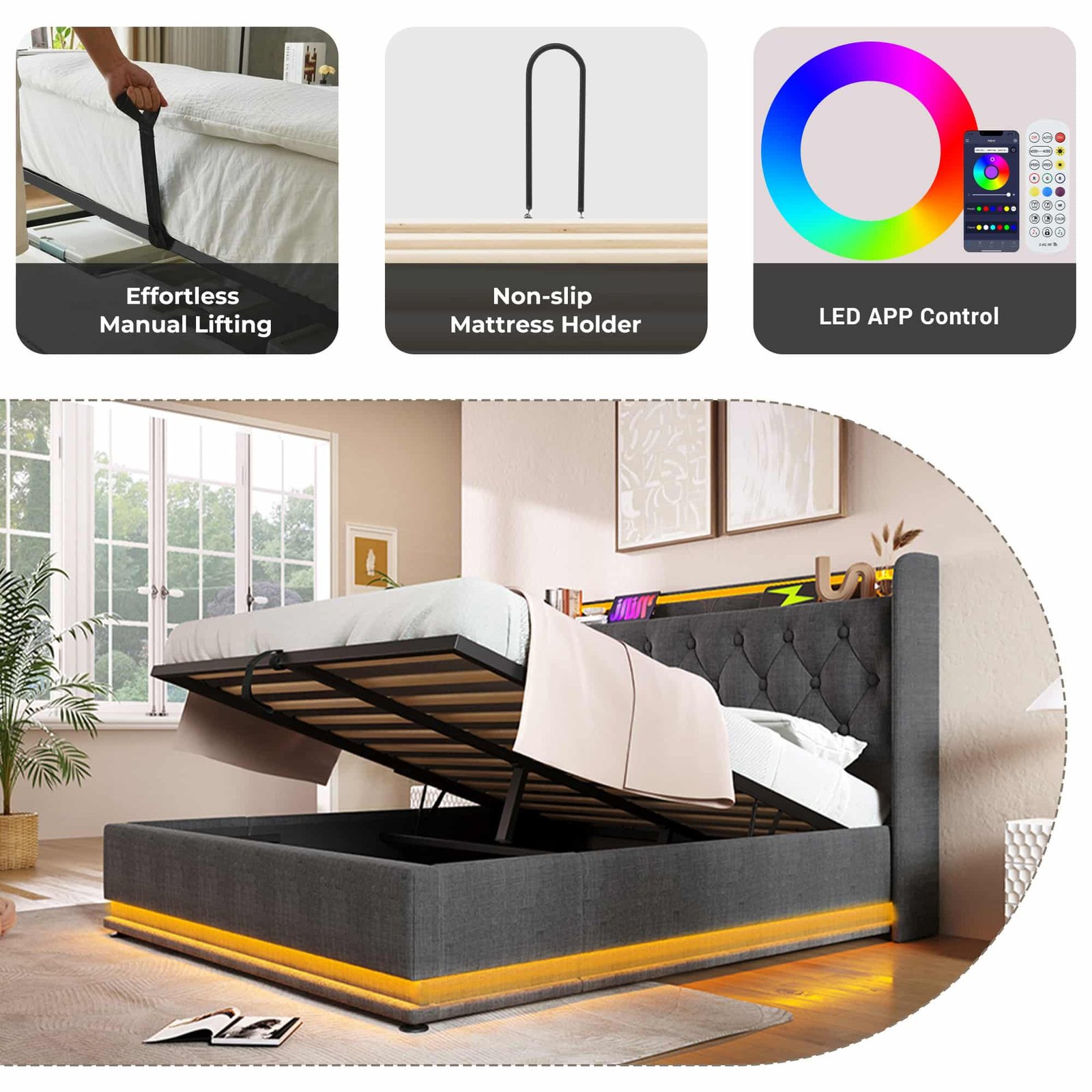 Gray Linen LED Storage Bed – Modern Queen Bed with Surround Lighting & USB Charging