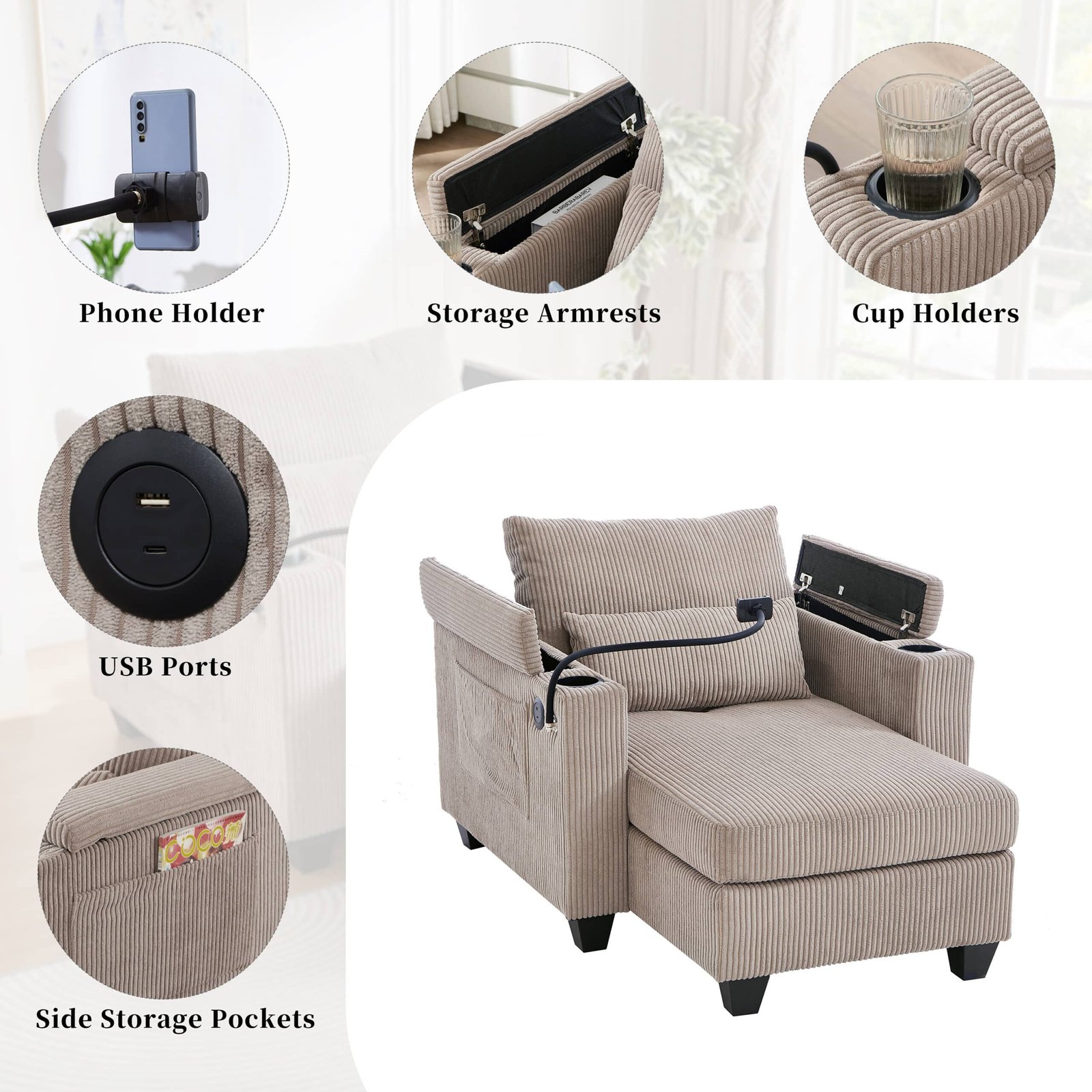 - Ample Storage Space: Each armrest features hidden storage compartments, ideal for stashing remote controls, chargers, and snacks, helping to keep your space clutter-free.
