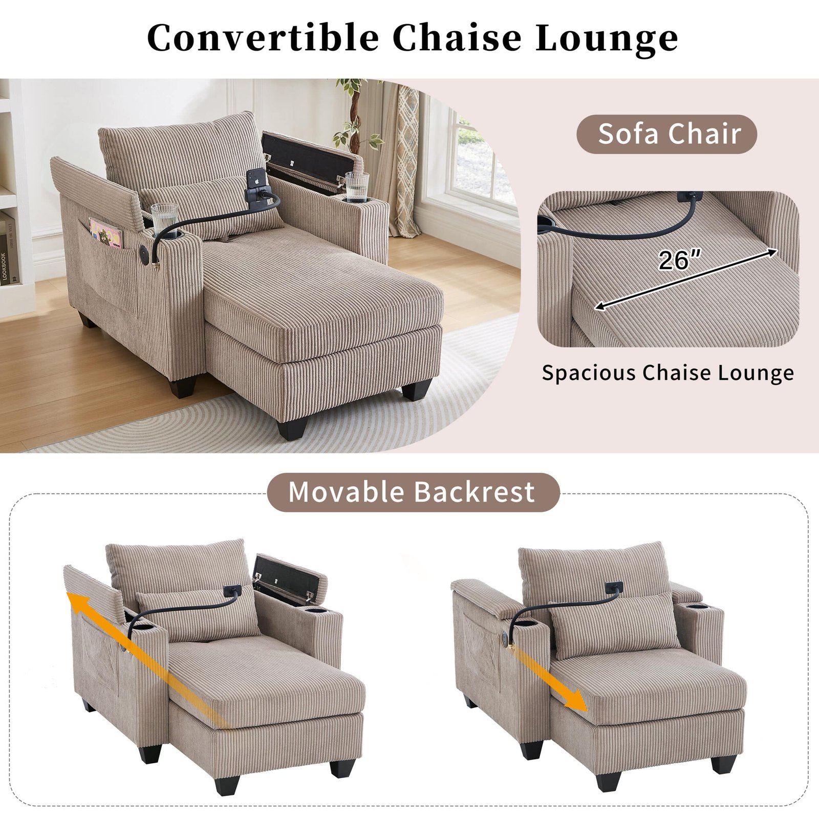 Soft Corduroy Convertible Chaise Lounge with USB Ports and Hidden Storage – Brown