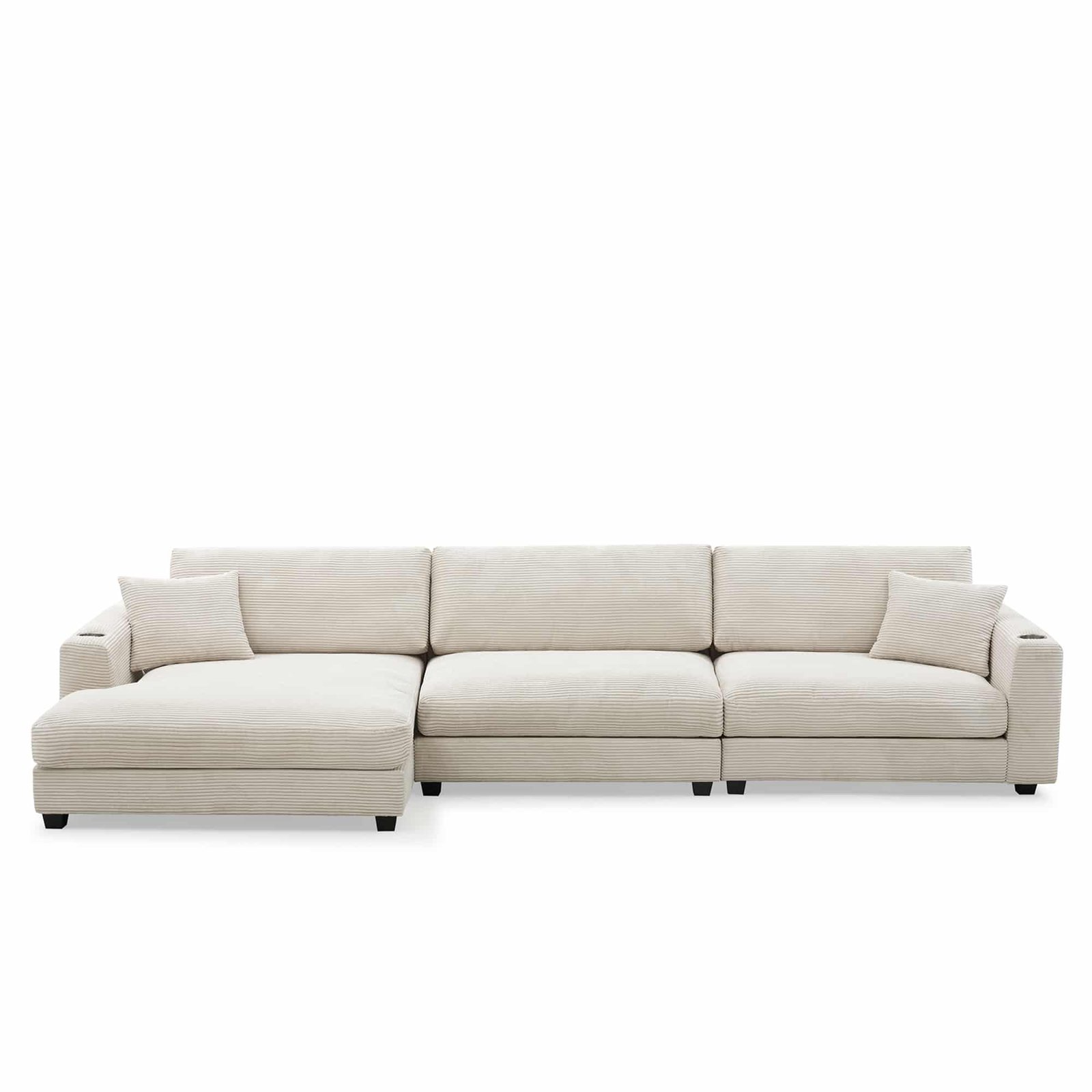 Thick Corduroy L-Shaped Sectional Sofa with USB Charging Port and Cup Holders – 3-4 Seater – Available in 3 Colors