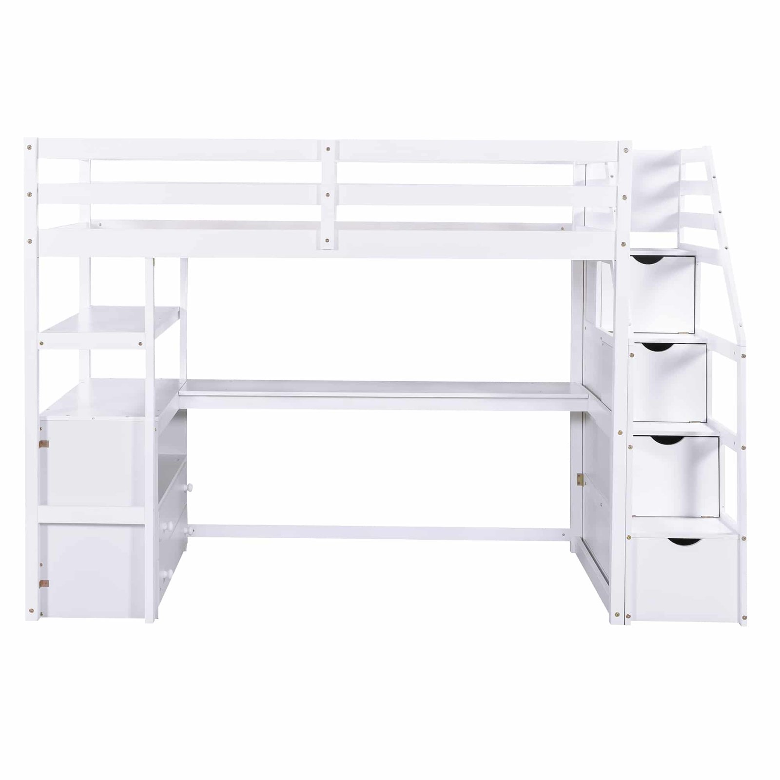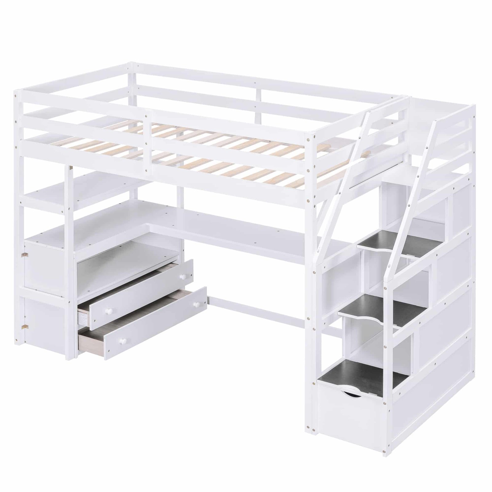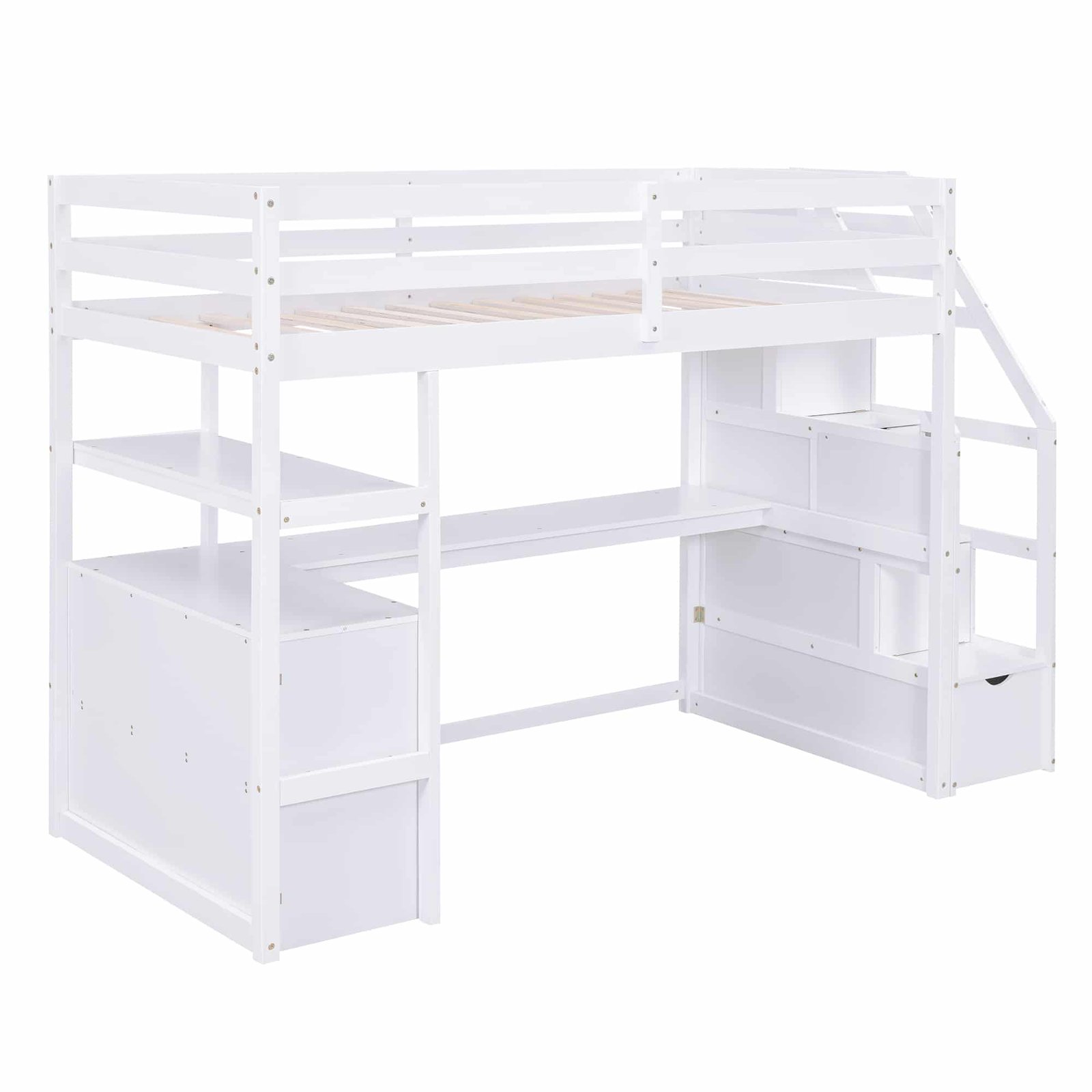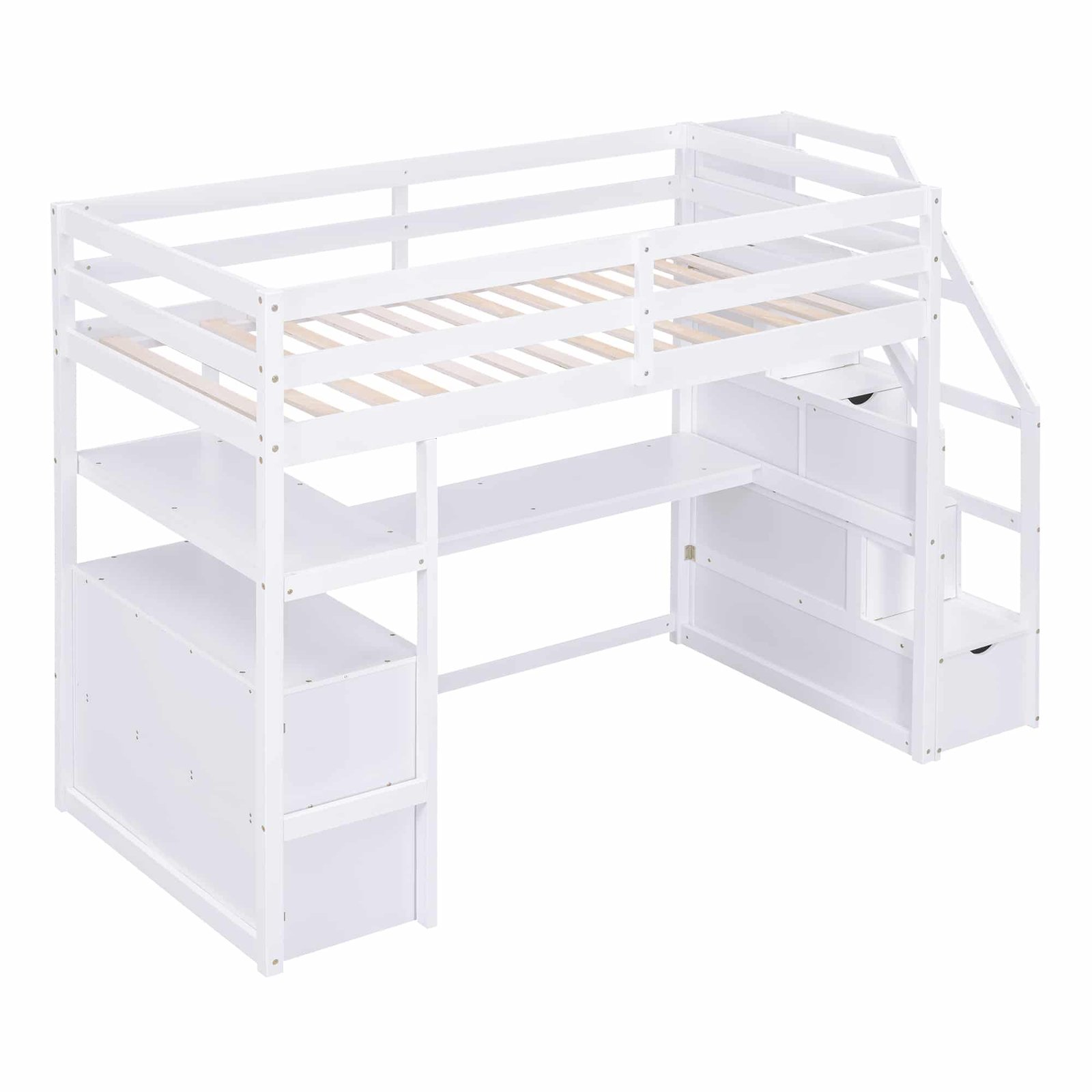 Twin Size Loft Bed with Desk and Shelves, Two Built-in Drawers, Storage Staircase, White