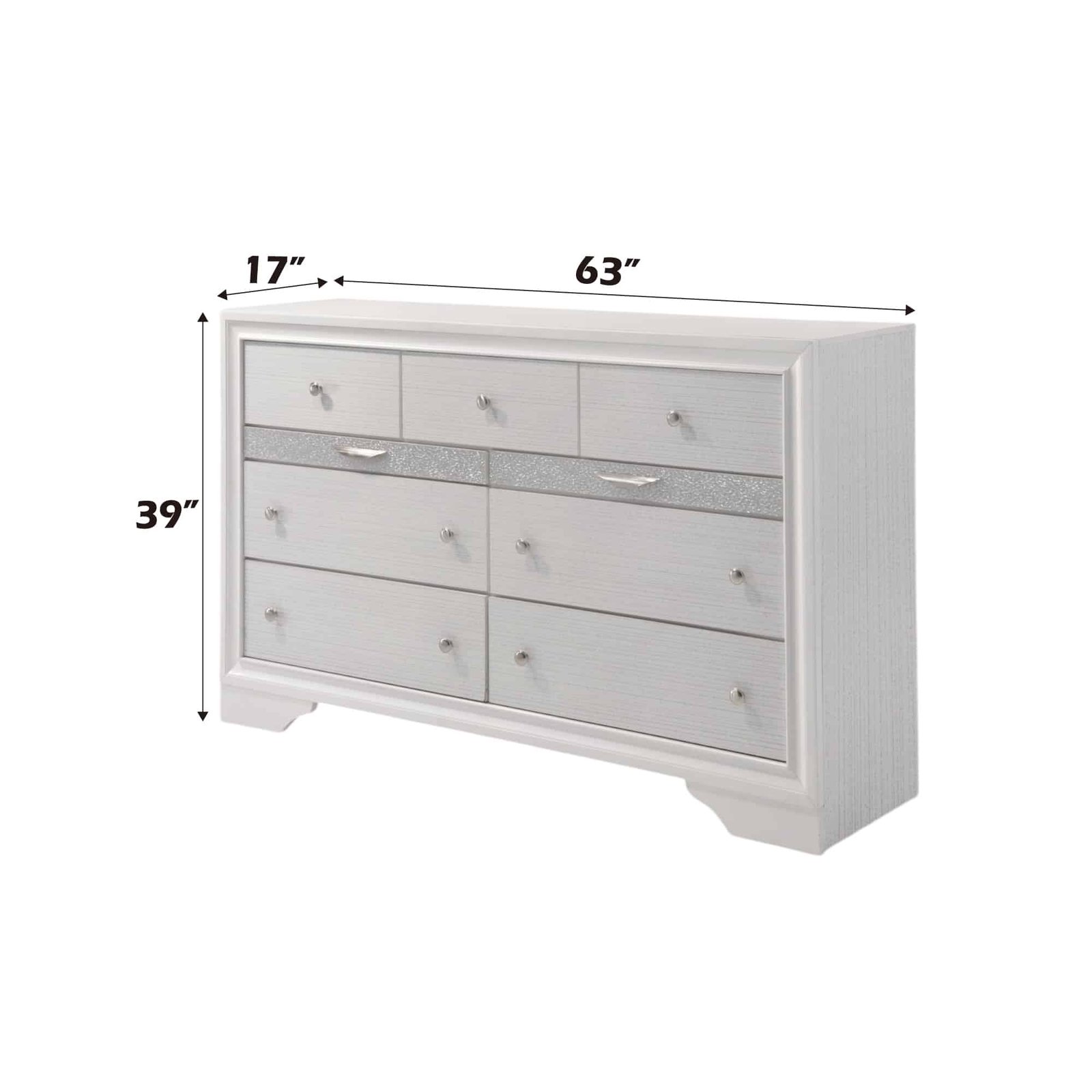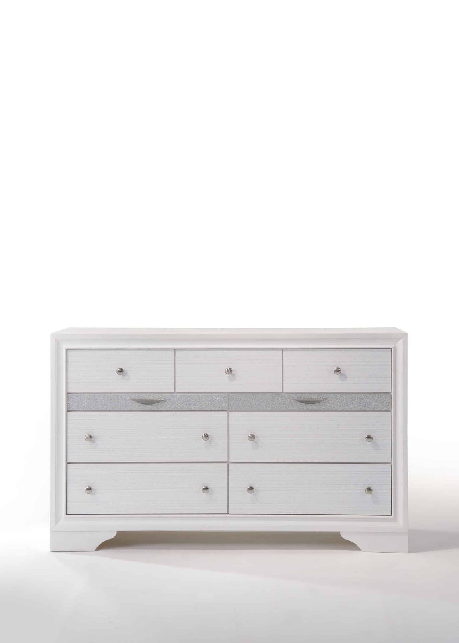 Introducing the Naima White Finish Dresser, a perfect blend of style and functionality designed to bring a touch of elegance to your home. With its sleek white finish, this dresser enhances any bedroom decor while providing ample storage for all your essentials.