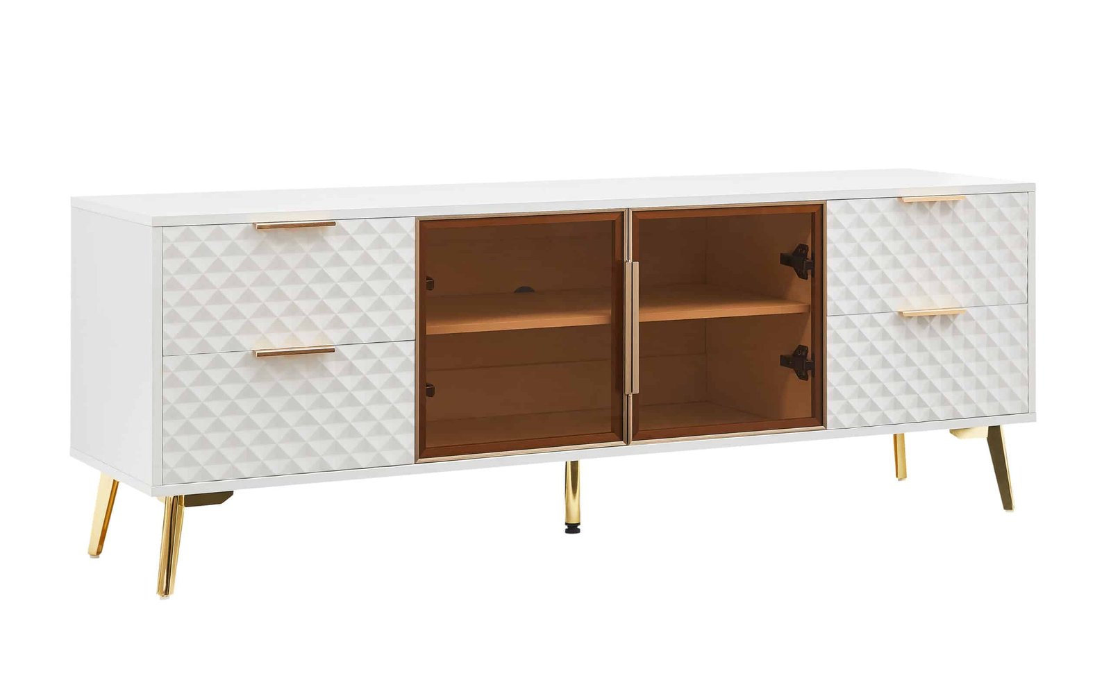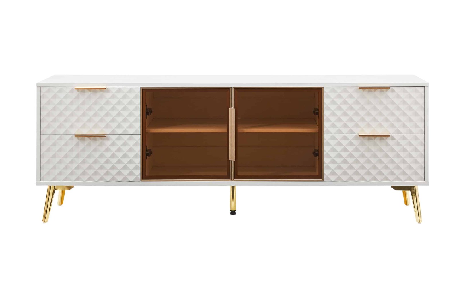 Elevate your home décor with the stunning Deluxe Sculpted Modern Fashion Geometric Style TV Stand. This multi-functional piece combines sleek design with practicality, making it the perfect addition to any contemporary living room. With its luxurious geometric carvings and clean white finish, this TV stand not only serves as a functional furniture piece but also as a statement piece that enhances your interior aesthetics.