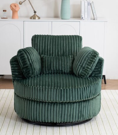 Stylish green corduroy swivel chair with plush comfort, 360° rotation, and easy setup—perfect for modern living rooms and bedrooms.
