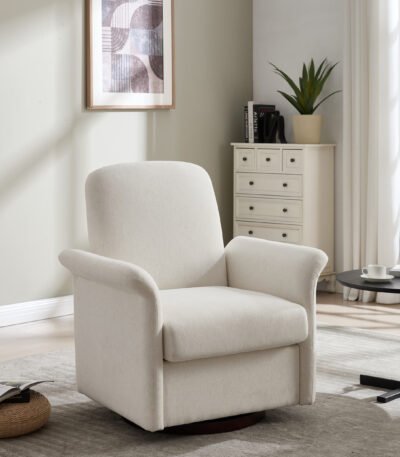 Linen Barrel Swivel Accent Chair with Solid Wood Base – Beige