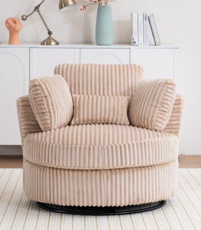 Plush Corduroy Round Barrel Accent Chair with 360° Swivel and 4 Pillows – Beige