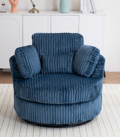 Comfortable blue corduroy barrel chair with 360° swivel, plush padding, and included pillows. Perfect for living rooms and bedrooms.
