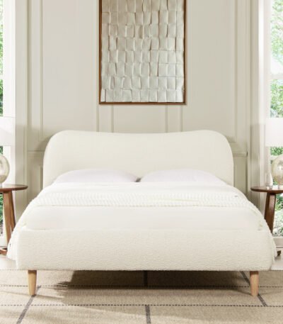 Upholstered Curved Headboard Platform Bed with Mattress Supports – Ivory White Boucle